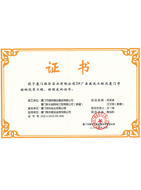保灃2號廠房建設(shè)工程廈門市結(jié)構(gòu)優(yōu)質(zhì)工程證書